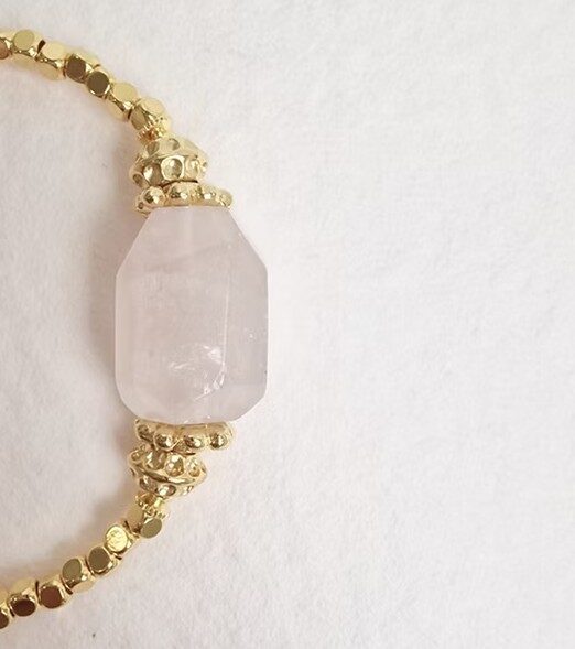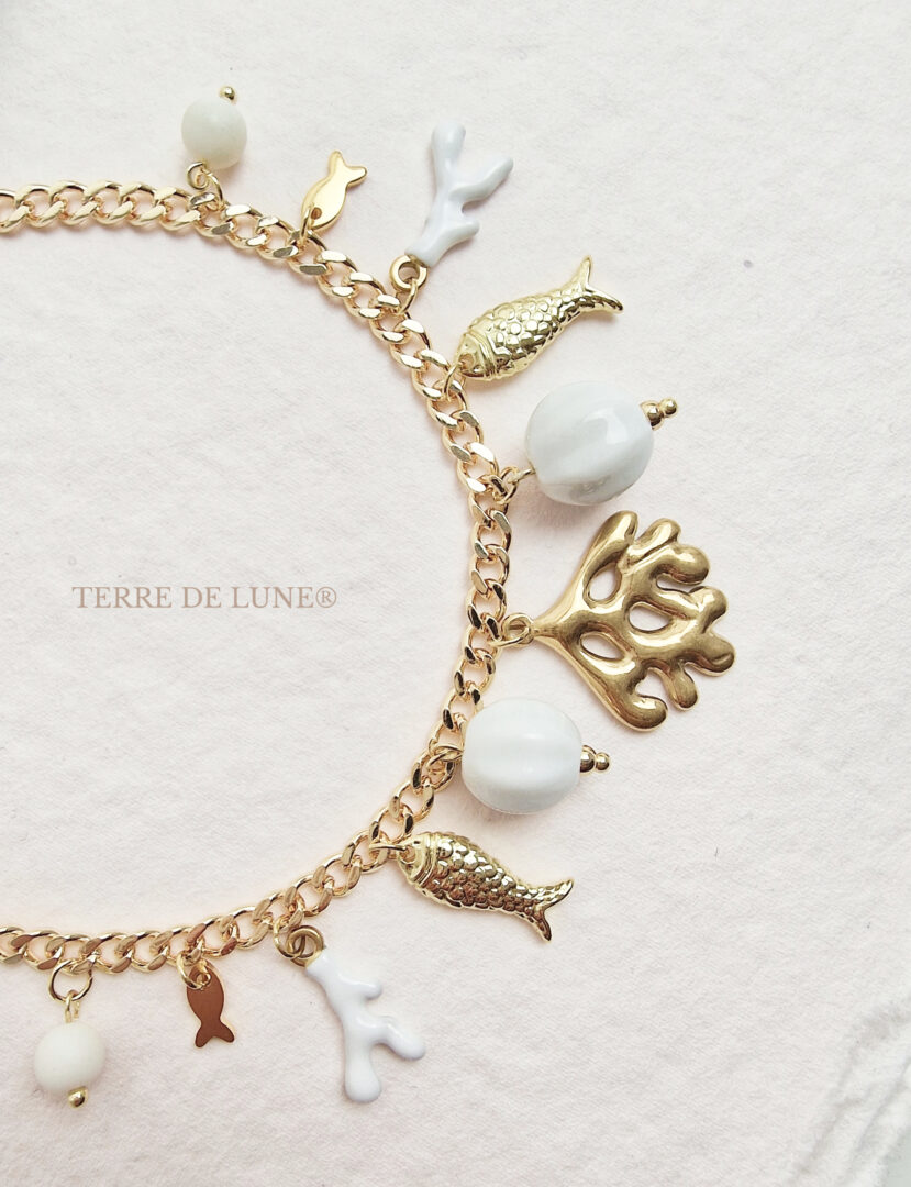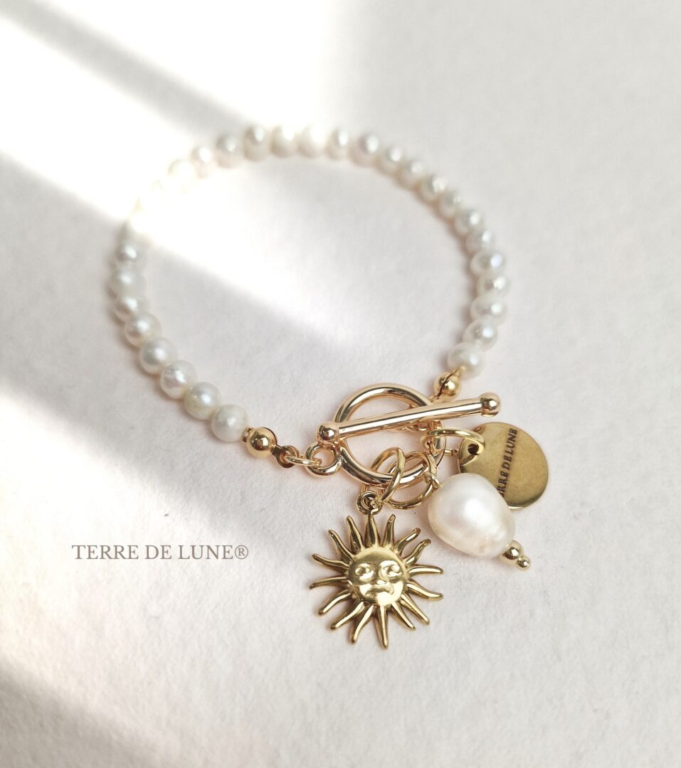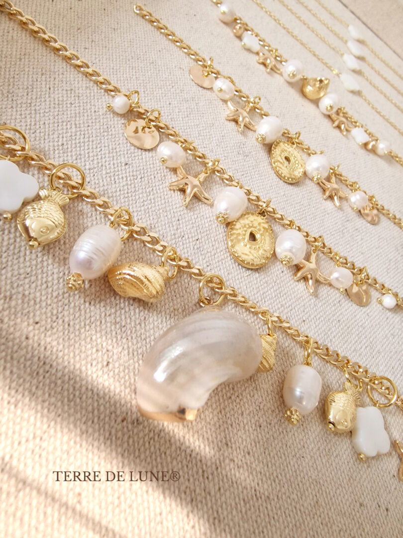 Pierres naturelles, perles d’eau douce, nacre et dorures fines se rencontrent pour sublimer une féminité douce et solaire.