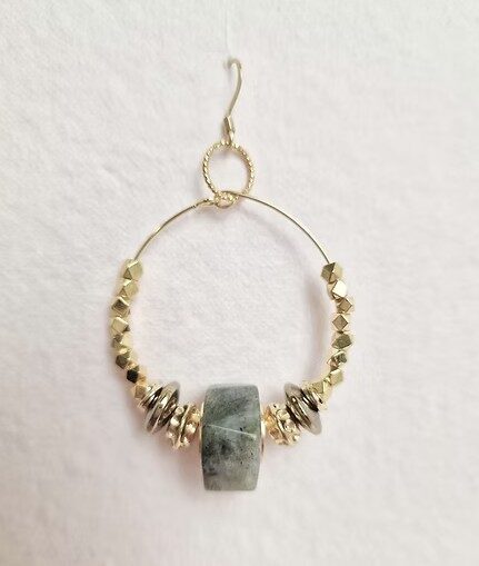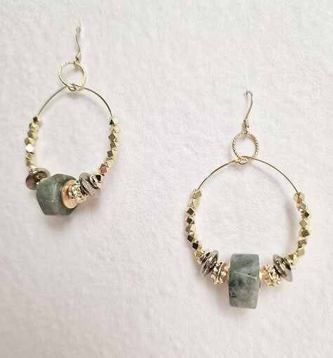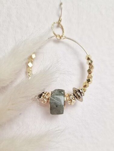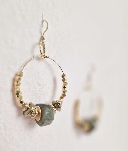 Boucles d’oreilles créoles en enfilade de petites perles cubiques et de pierres naturelles.